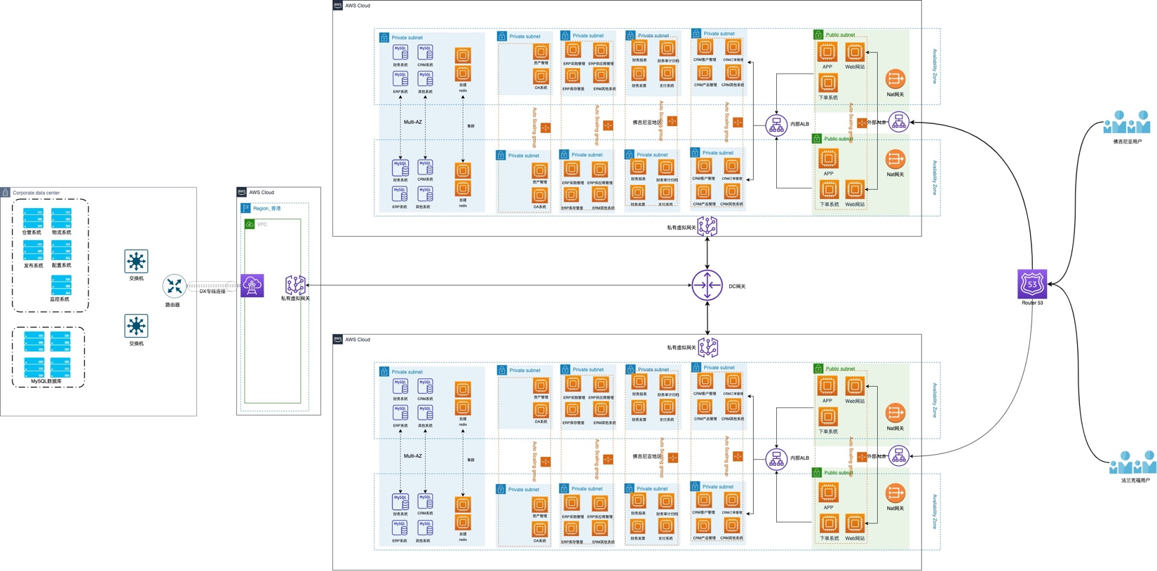 佛吉尼亚regin使用60+台linux EC2部署web网站,APP,CRM系统,OA系统,使用8~10台windows系统部署.net开发的老系统;使用2台c5.xlarge Linux系统部署订单系统;法兰克福使用同等配置部署一整套系统