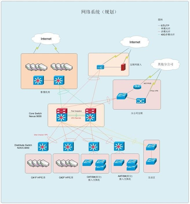 本次网络系统为已有网络系统升级万兆核心网络系统建设,本次网络系统建设将 新设立由两台 Cisco Nexus 9000 交换机组成的万兆网络核心,整理现行网络, 并达到优化公司网络系统的目的。本次网络系统建设主要分为 3 部分: