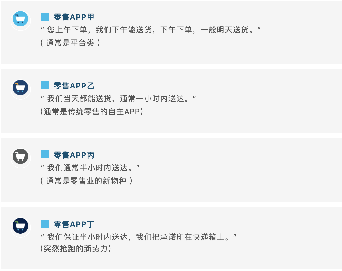 这里无关褒贬,甲乙丙丁都是新零售的杰出选手,与传统零售相比,它们都是行业的颠覆者和优等生,