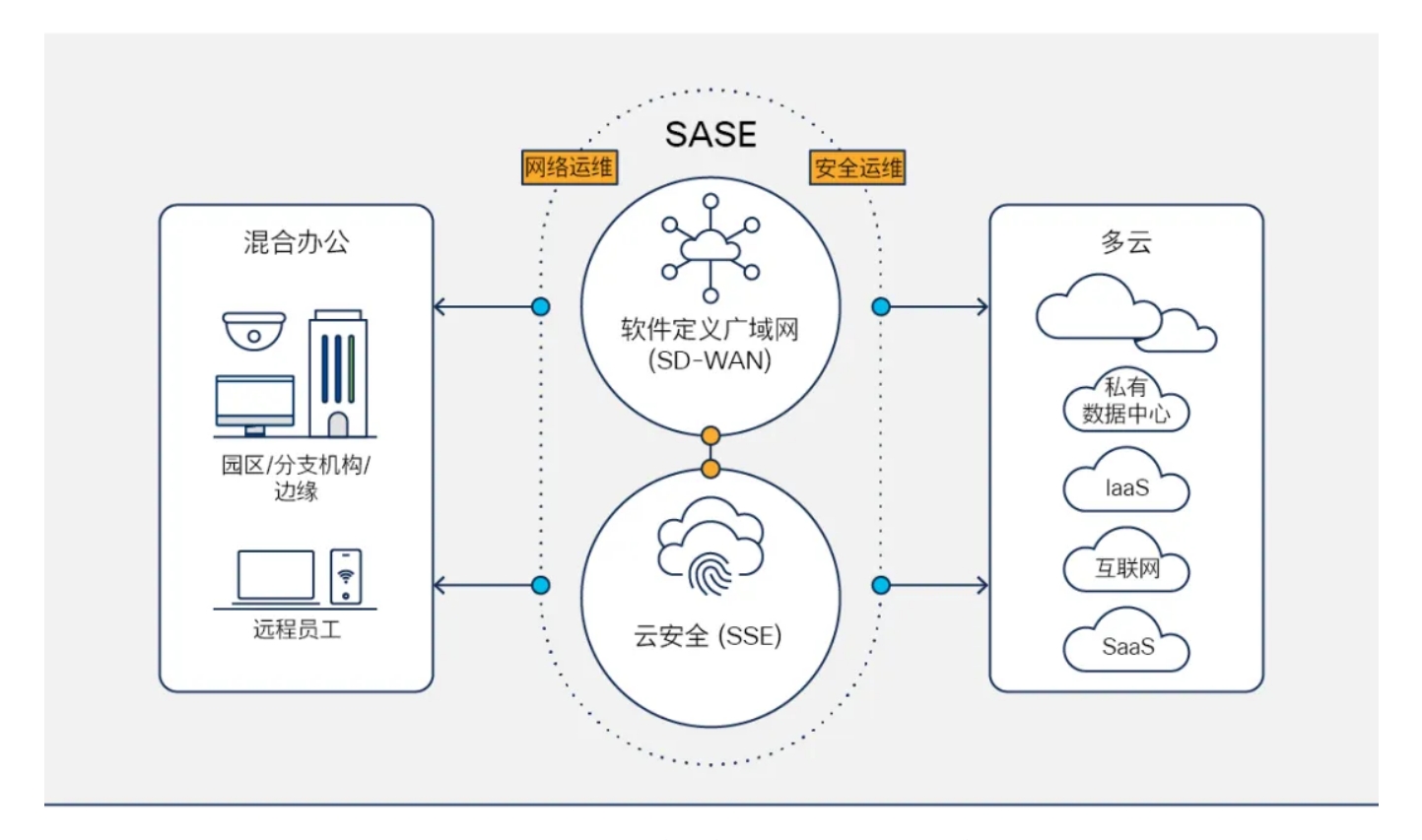 SASE 能够提供这样的融合环境以及集中的统一管理,是一种从根本上简化安全和网络运维的方式。Gartner 将其定义为提供融合网络与安全即服务的多层面解决方案。其功能包括 SD-WAN、安全 Web 网关 (SWG)、云访问安全代理 (CASB)、NGFW 和零信任网络访问 (ZTNA)。SASE 支持分支机构、远程员工和本地安全访问使用案例。