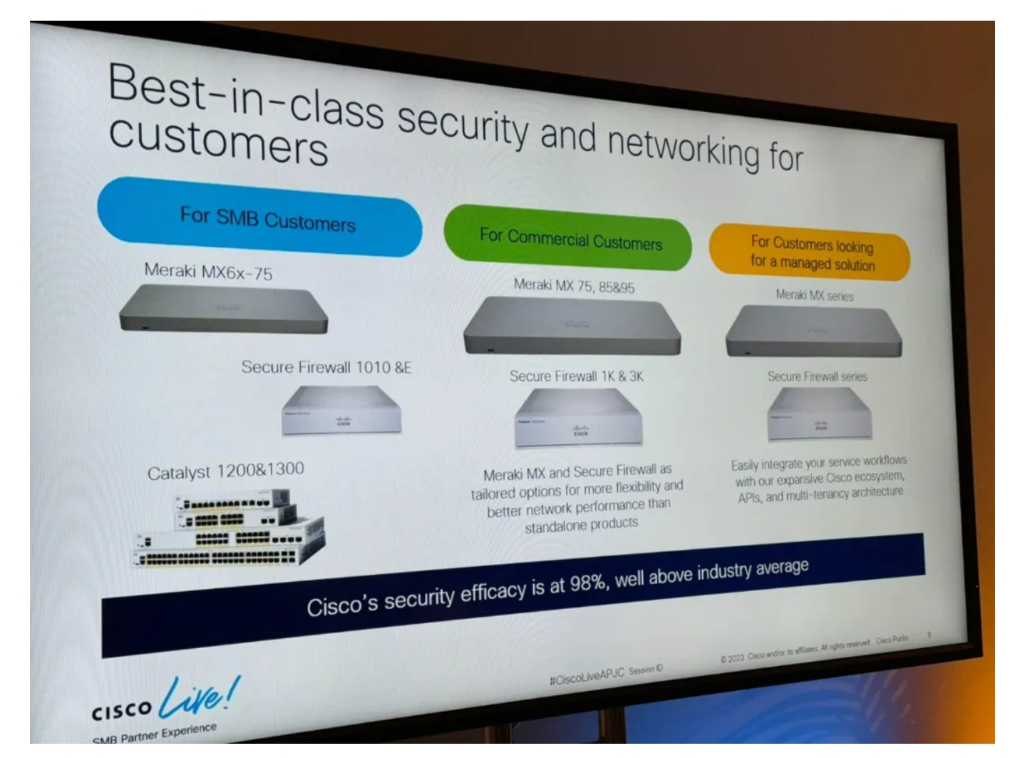 SMB 商业市场一直以来是思科市场拓展布局的重要一极,本次大会期间思科重磅发布了 Cisco Catalyst™ 1200 和 1300 系列交换器及 Cisco Meraki MX,三款产品专为中小企业的特定需求及预算而精心打造,有助于中小企业简化并加速网络和安全设置。