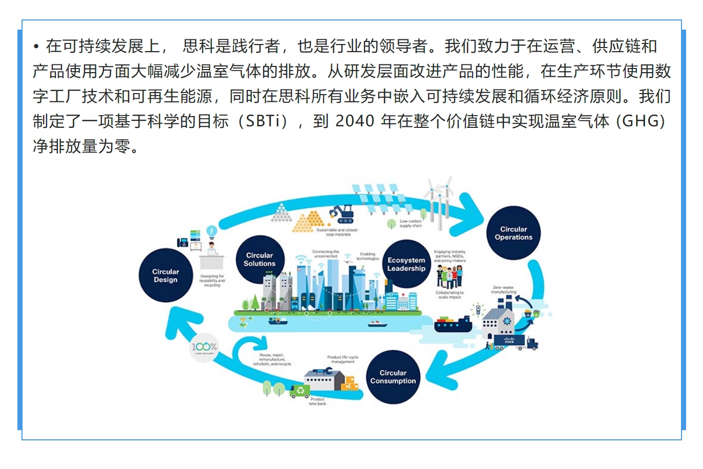 如果您在制定可持续发展战略,则需要不断寻找创新机会,创造业务价值,并重新评估目标。Gartner 的最新研究报告强调,IT 主管不应只是被动应对来自利益相关者和监管机构的压力,而应以此为契机主动支持变革,从而发现新的增长机会,例如创新或采用新的产品和业务模式。在高度融合的全数字化净零时代,网络是关键的推动因素。在掌握净零排放进度时需要捕获、监控、衡量和报告大量的数据,因此对先进网络有更多的要求。这是为了确保有效地收集、分析和保护数据,实现自动化。未来我会给大家详细介绍思科在这方面的解决方案和产品。思科已准备就绪,随时可与您携手应对此关键挑战。在满足人类需求和实现可持续未来之间,思科成就无尽可能。