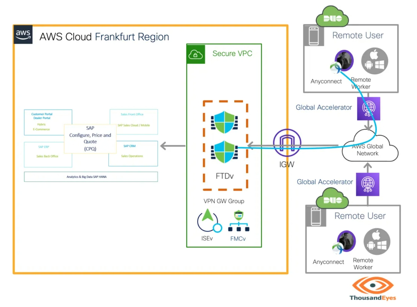 针对这家企业的问题,Cisco和亚马逊云科技设计了联合解决方案,来加速分布在全球各地的销售人员访问SAP CPQ业务系统,并且使得加速效果“看得见”,也就是能够直观地反映方案实施前后速度的变化。只有看得见加速效果,才能确认加速方案是否真的有效。