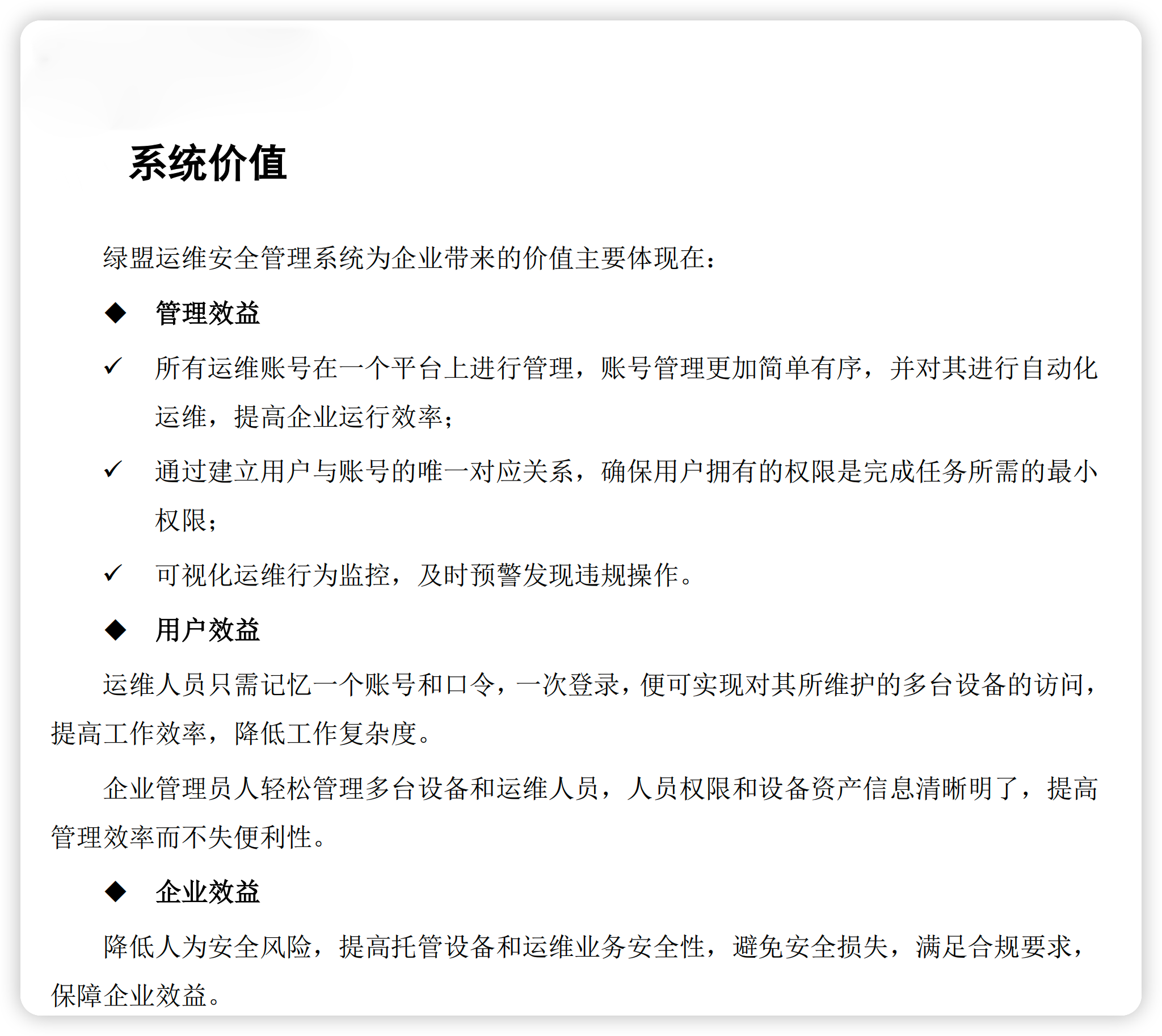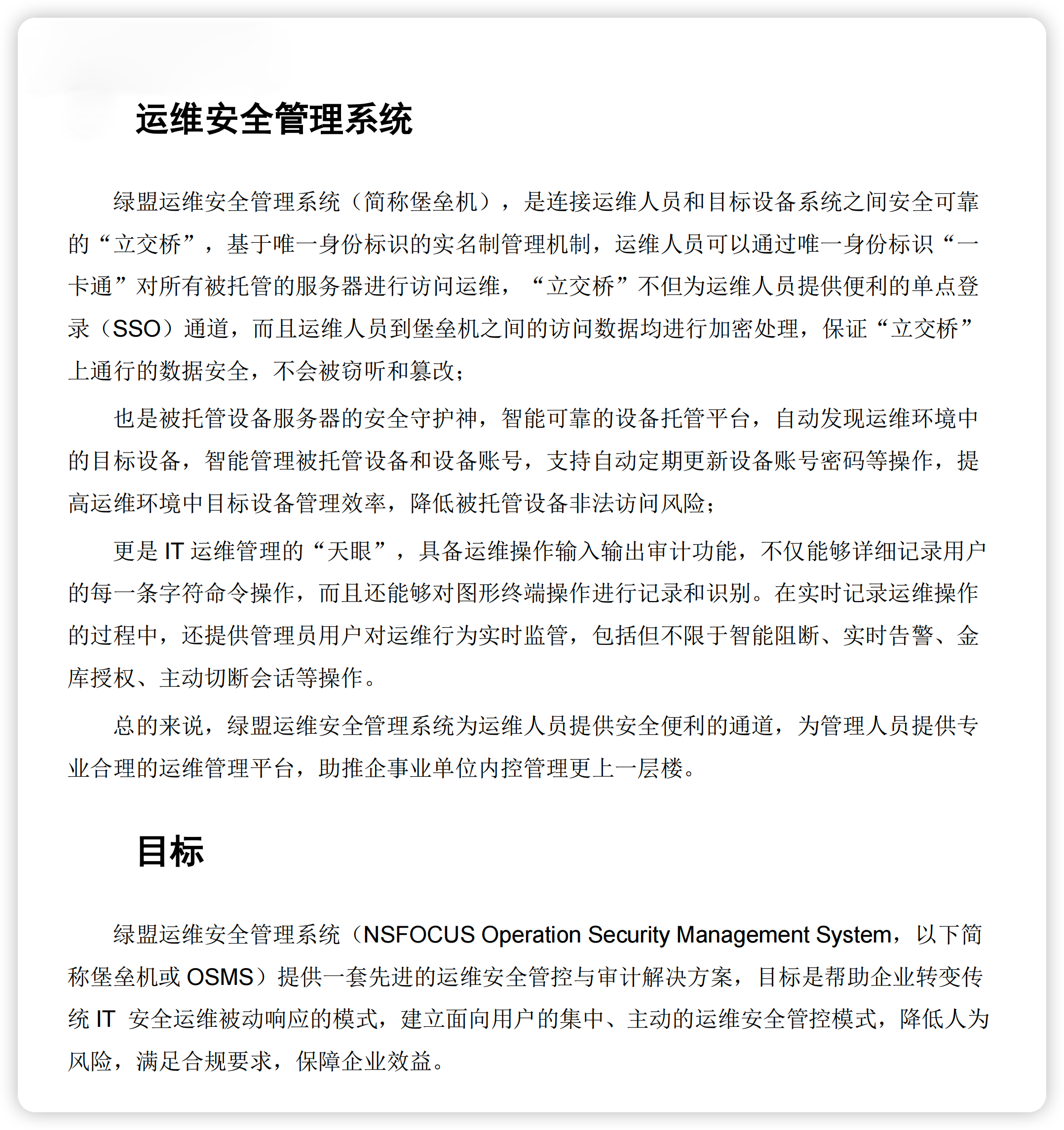 绿盟运维安全管理系统 V5.6(简称 OSMS 或堡垒机),是一套先进的运维安全管控与审计解决方案,目标是帮助企业转变传统 IT 安全运维被动响应的模式,建立面向用户的集中、主动的安全管控模式,降低人为风险,满足合规要求,保障企业效益。