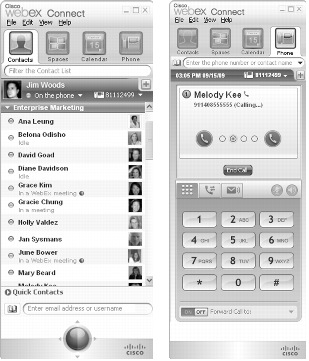 您可以接收来电通知,可以选择接听电话或将呼叫转移到语音信箱。与思科UC的整合™对于WebEx连接集成软电话,您可以接听电话,无论您在哪里使用您的笔记本电脑或个人电脑。 |