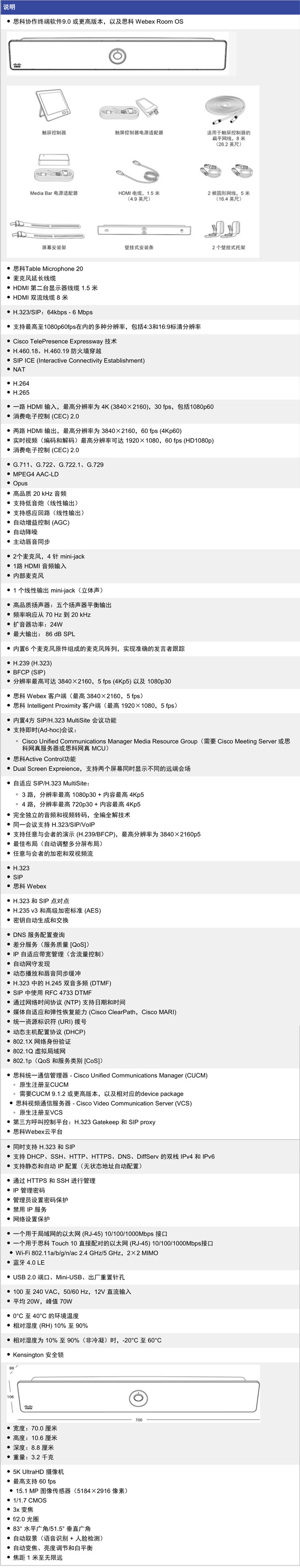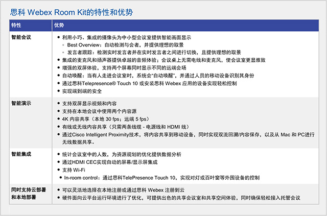(例如发言者跟踪、无线共享和 4K 内容)的同时,思科已经能够以简单且具成本效益的方式,将这些创新技术引入到中小型团队会议室。思科推出Room Kit,