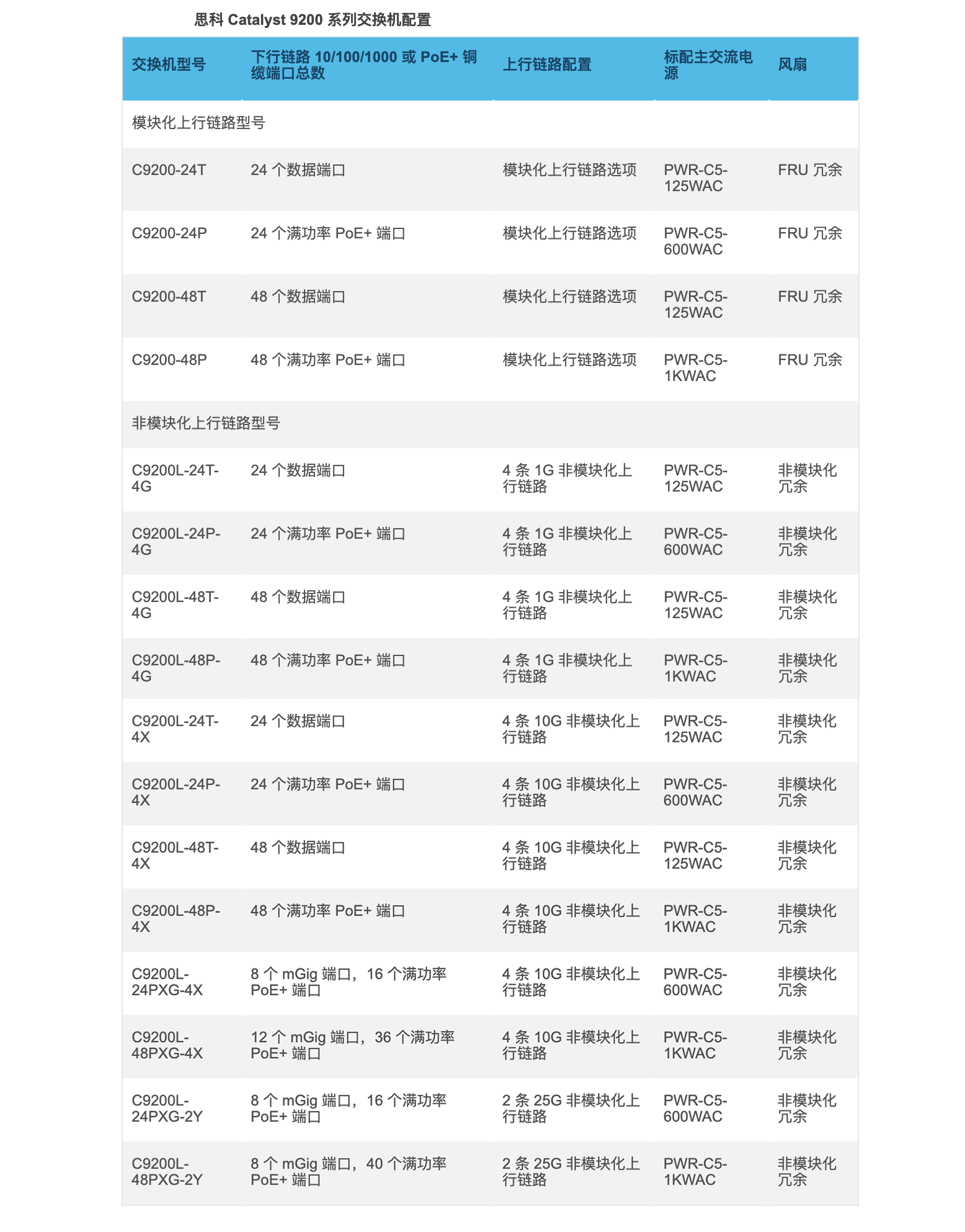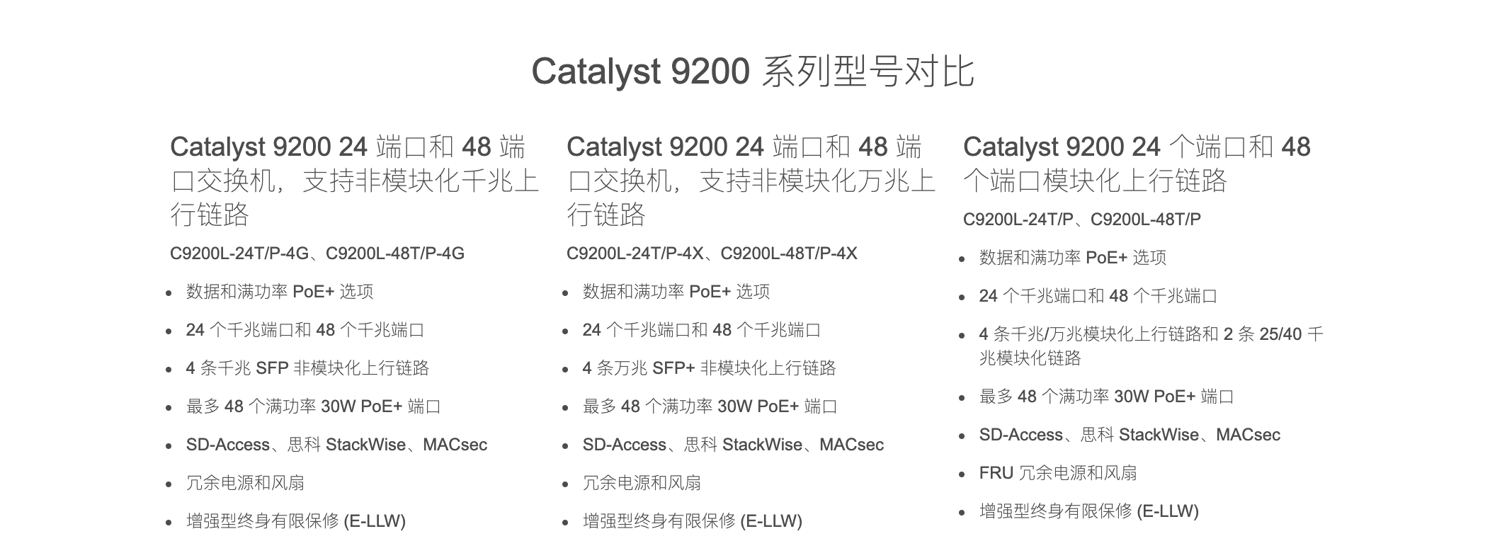 Catalyst 9200 系列交换机具有满功率 PoE+ 功能、冗余电源和风扇、最高 160 Gbps 堆叠带宽、模块化上行链路、第 3 层功能支持和冷修补能力,其出众的恢复能力和先进的架构在业界无与伦比,是具有成本效益的分支机构接入解决方案。